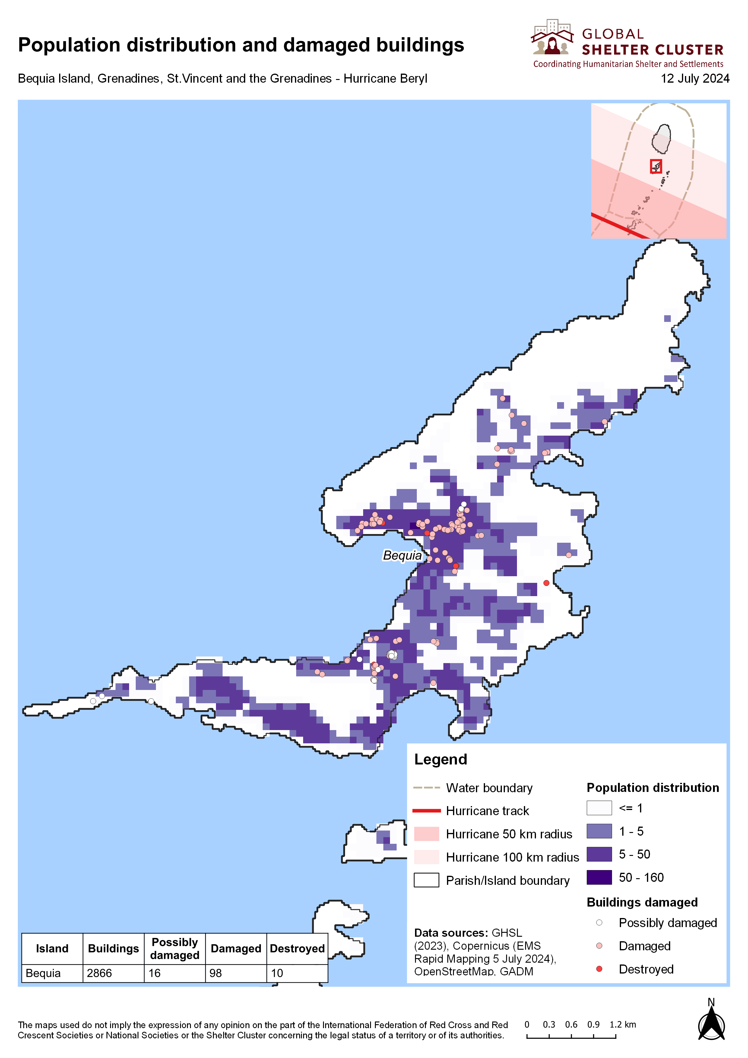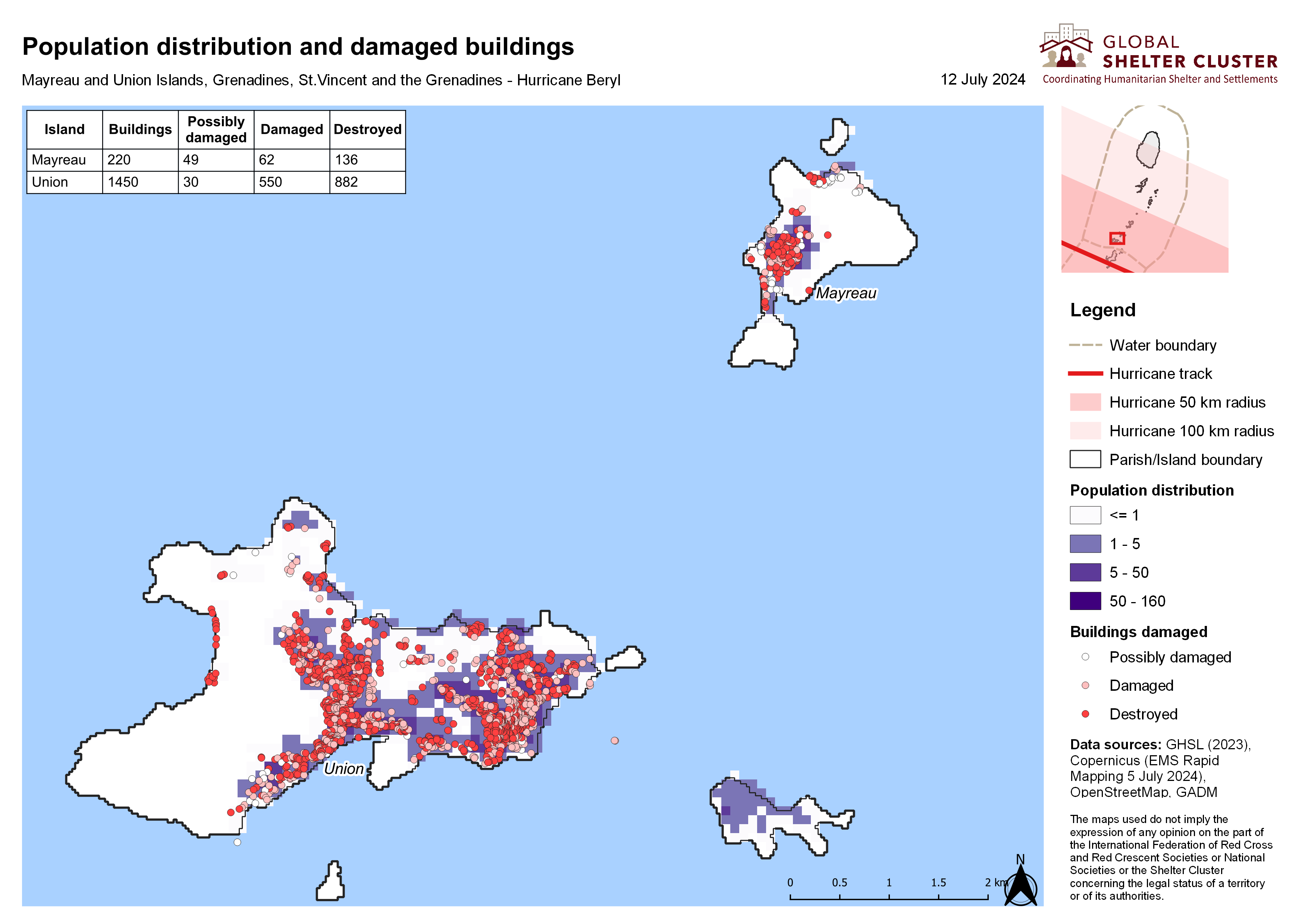 In Grenada, more than 1,600 people were reported in collective shelters, and as of July 8 around 383 persons. More than 98 per cent of the buildings have been severely affected in the Union, Carriacou and Petit Martinique islands, where most of the health facilities are compromised, as well as the terminal building Carriacou airport, schools and petrol stations. The northern parishes of St. Patrick, St. David, and St. Andrew on the main island also experienced significant housing and agricultural losses. The National Water and Sewerage Authority (NAWASA) reports only 52% of Grenada's water systems are operational, and communication is disrupted in Carriacou, Petite Martinique, and northern Grenada. There have been reports of severe agricultural destruction, particularly in Carriacou and Petit Martinique.